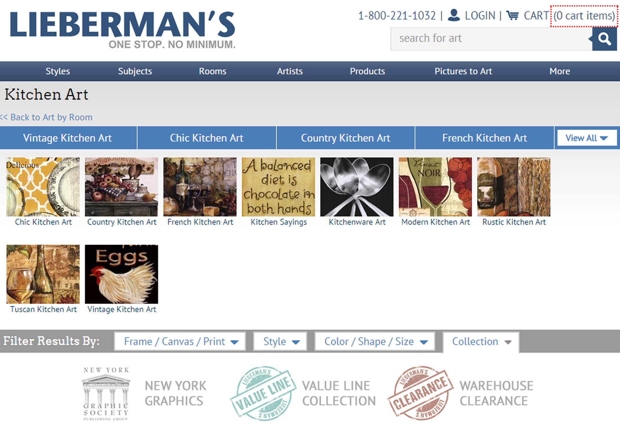 In addition to this change, we also have redesigned our website (New York Graphics Customers can search for any available art print with the same item number you used before). We have also added new filters which filter art by category, genre/style, subject, color, size, shape and much, much more. We have also just launched our new custom collection filters to all of our pages. This will allow you to narrow down your results to New York Graphic Society products, Value Line products and Clearance.